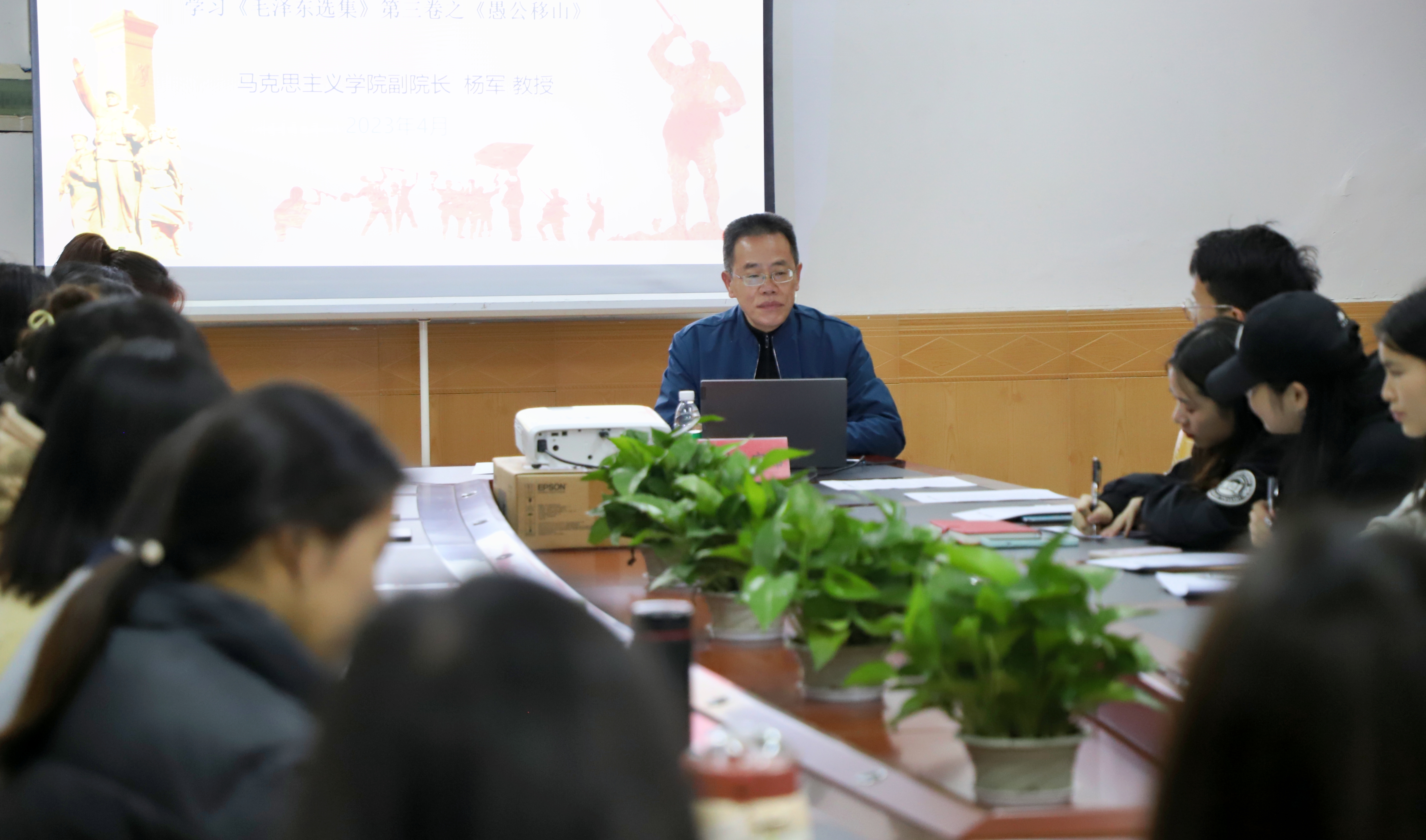 第一期读书分享会由我院副院长杨军教授主讲,杨军教授为学生们分享了红色经典《毛泽东选集》第三卷,重点讲授其中的《愚公移山》。他从作品概况、作品背景、内容品读与时代价值等四个方面引经据典,为学生们铺陈叙述了抗日战争期间中国共产党浴血奋战、艰苦奋斗的恢宏史诗,并结合当前深刻变化的国际战略形势,号召同学们正视奋斗路上的困难与波折,展现新时代奋发进取的精神风貌。